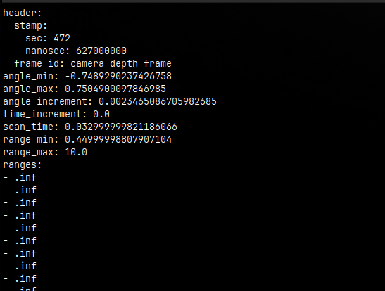 ros2 run depthimage_to_laserscan depthimage_to_laserscan_node \ --ros-args \ --remap depth:=/camera/depth/image_raw \ --remap depth_camera_info:=/camera/color/camera_info